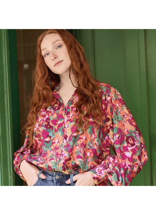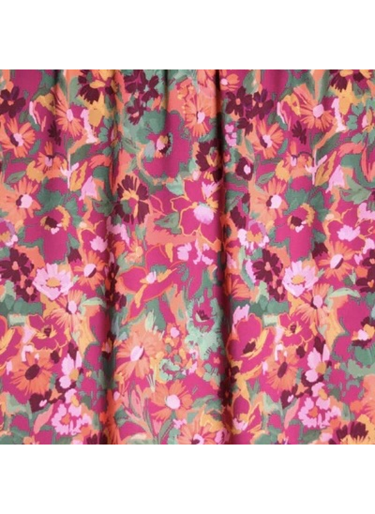 Een fuchsia viscose met bloemenprint in groen, roos, oranje,... Deze stof is geschikt voor blouses, jurken, rokken,...