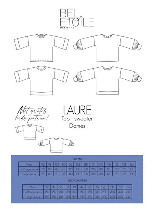 -het patroon afgedrukt op 2 A0 pagina’s in de maten 32, 34, 36, 38, 40, 42, 44, 46, 48, 50, 52 en 54 + kids 92-164