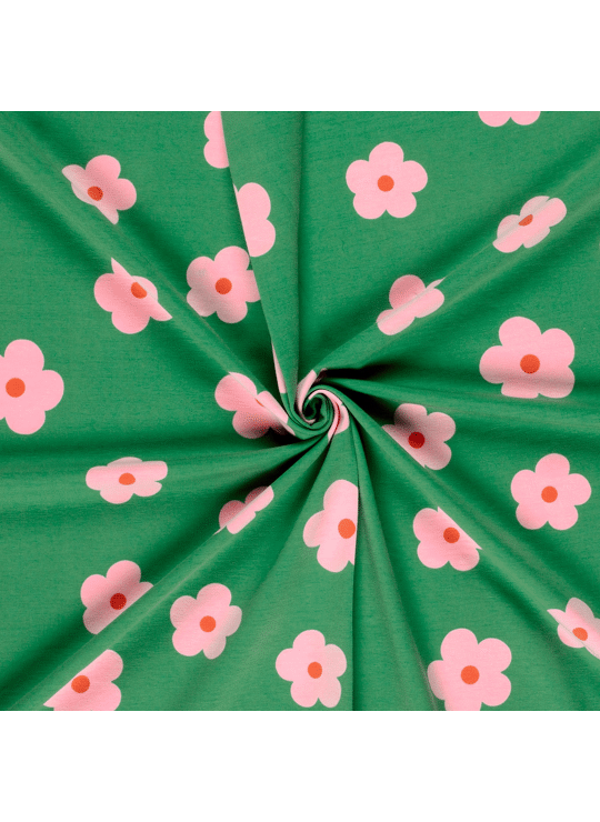 Tricot met roze bloemen.